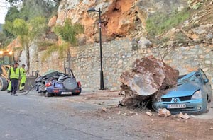 At 14.10h on Wednesday the 4th, in Otívar, a huge boulder fell onto parked cars beneath, completely destroying two and damaging three others.