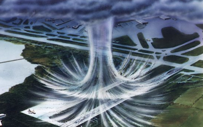 A downburst is created by a column of sinking air that after hitting the surface spreads out in all directions and is capable of producing straight-line winds of over 240 km/h often producing damage similar to, but distinguishable from, that caused by tornadoes.