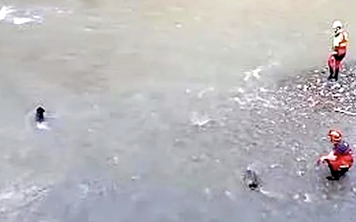 Two fire personnel, tethered together, managed to get it to safety, with one of them acting as anchor on the bank of silt, and the other wading out to catch the dog as it was being swept past.